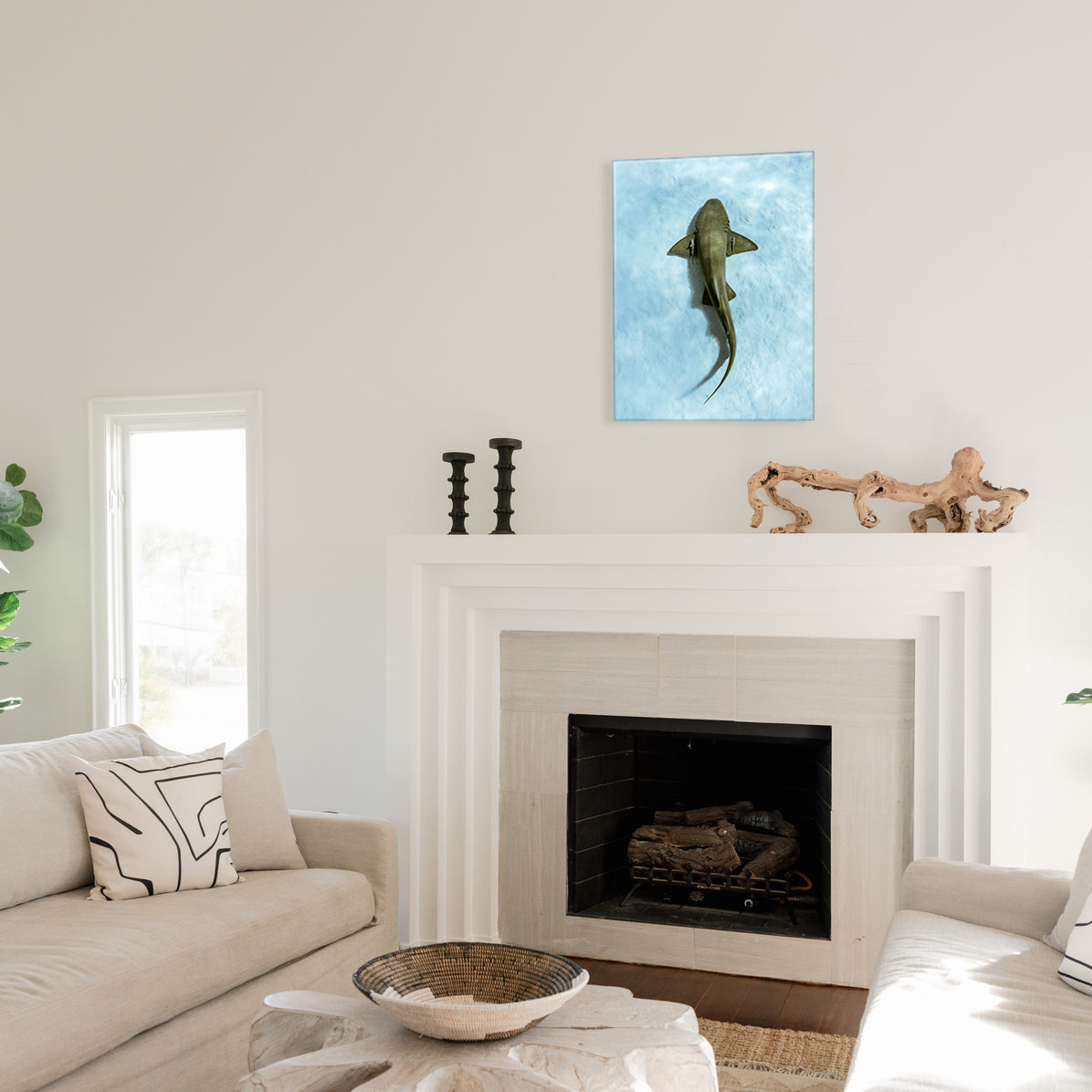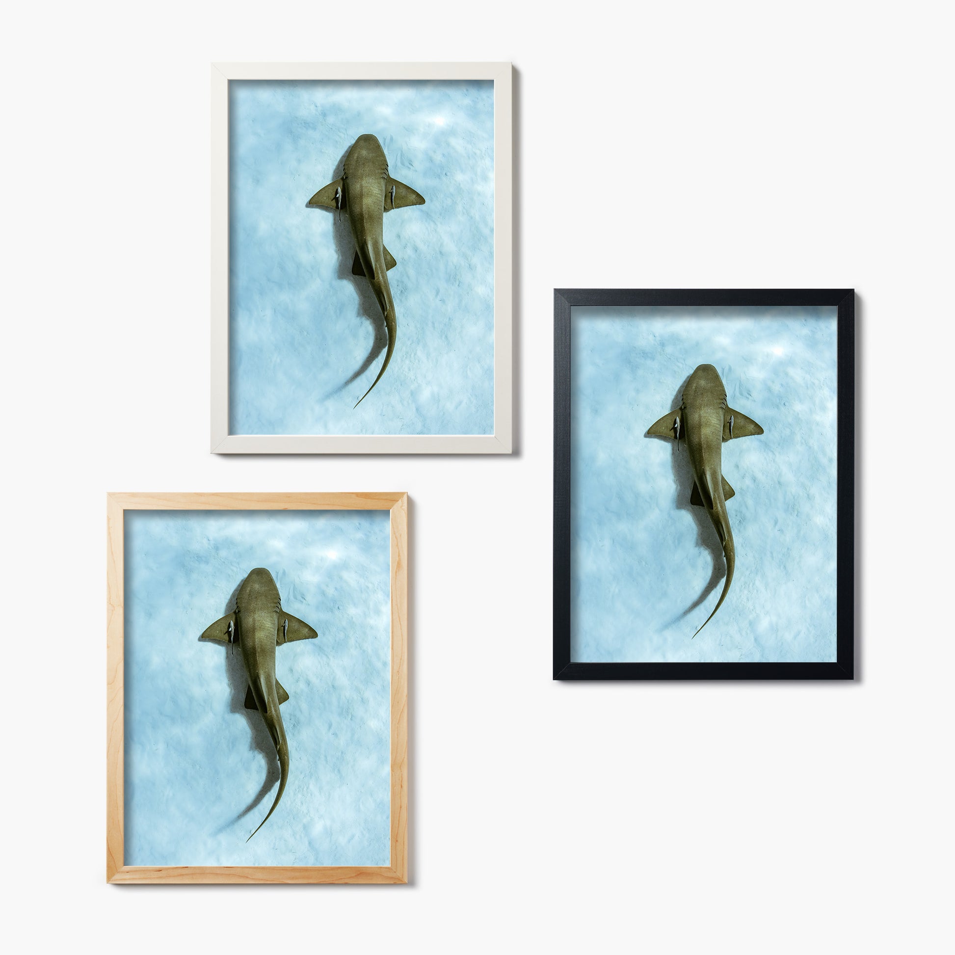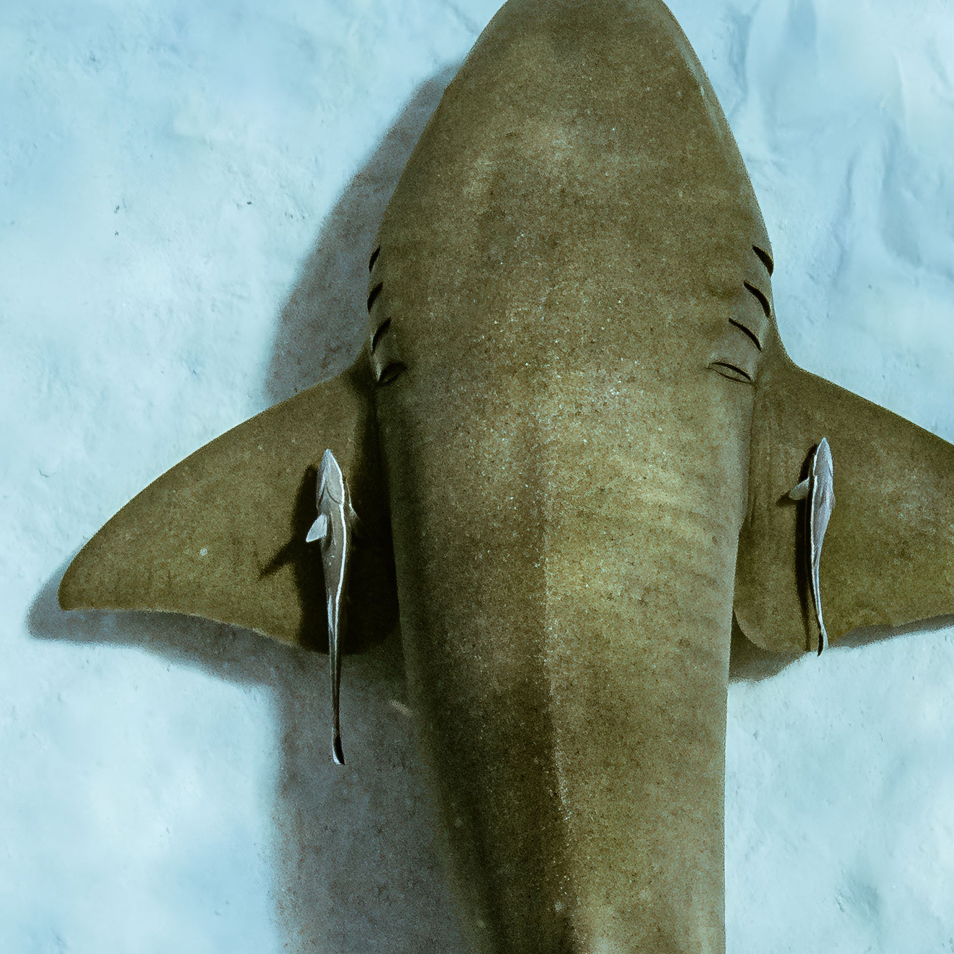 A shark that comes with an entourage. Jay Clue’s overhead snap catches this nurse shark gliding by with its pair of pilot fish. Cyan sands and cool vibes make this Bahamas moment feel actually calming. 10% of proceeds from this print go to Sharks4Kids to support shark education, science, and conservation for the next generation of ocean advocates.