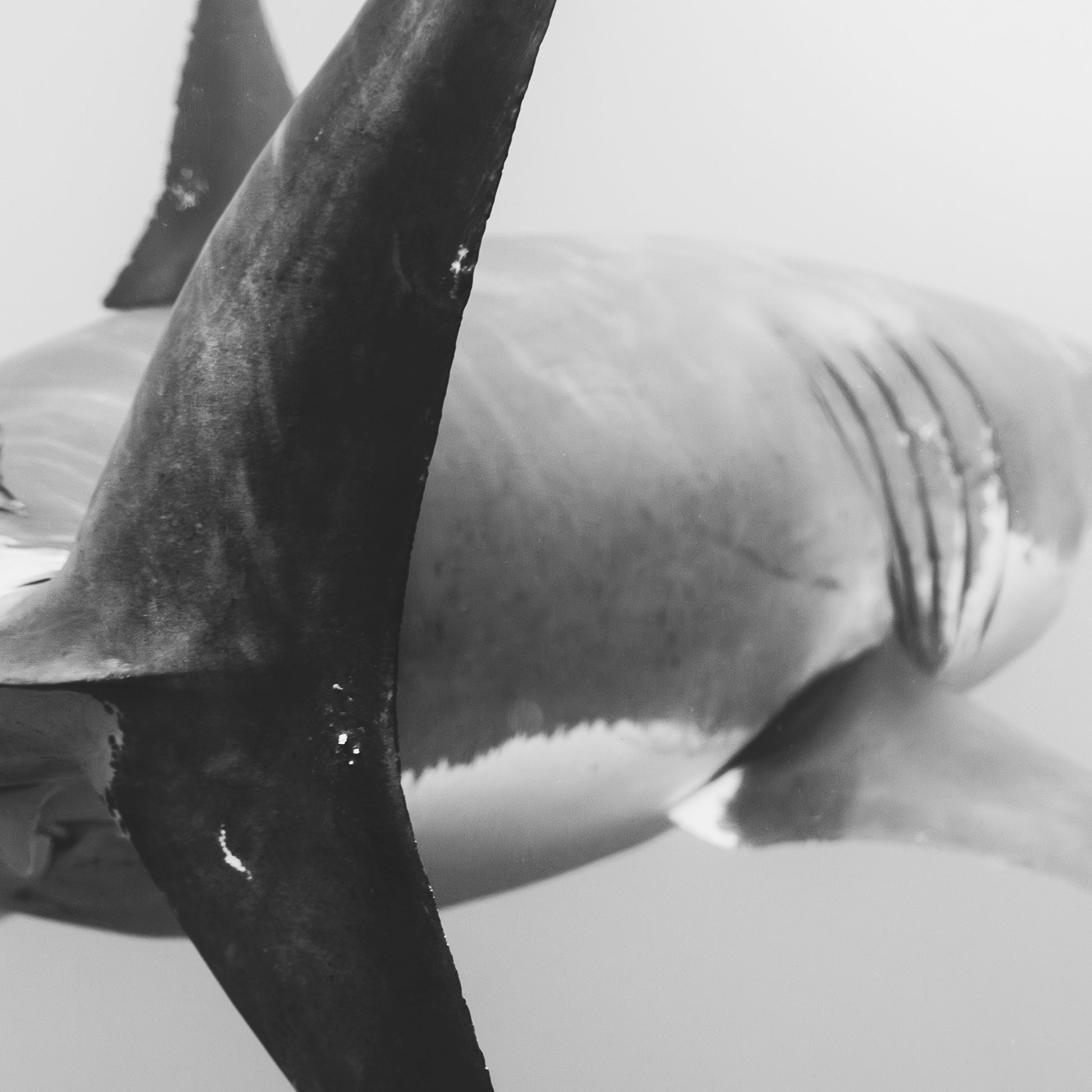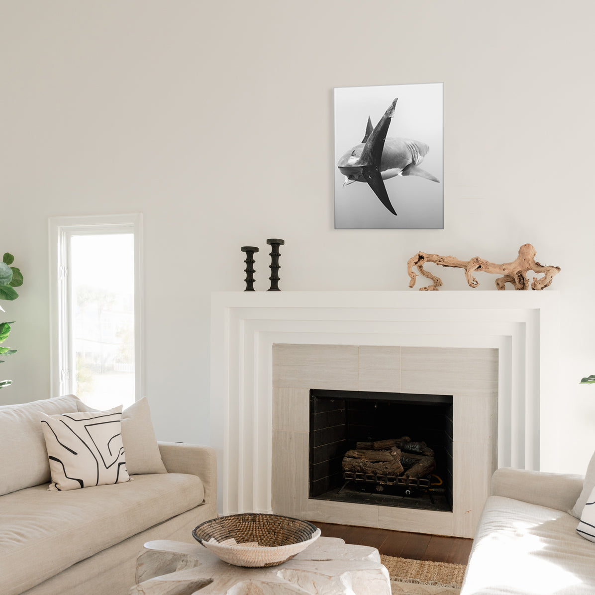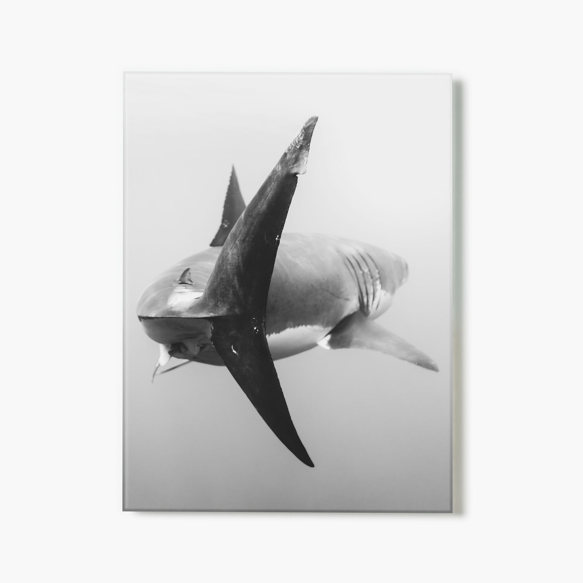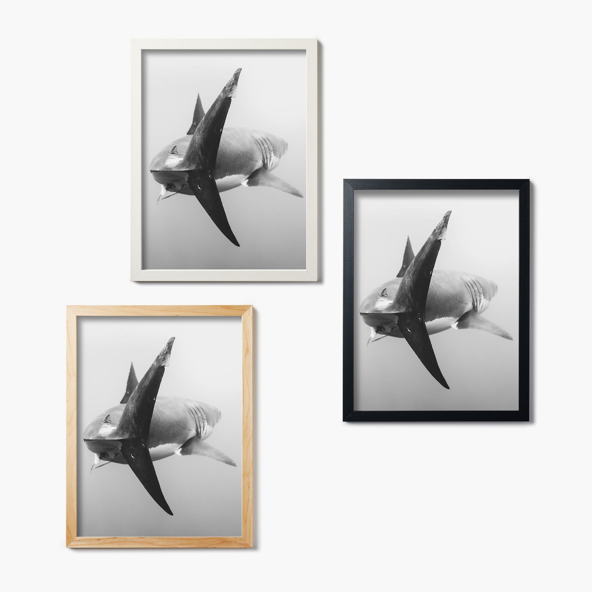 Now that’s an exit. In bold black and white, photographer Mike Coots captures the powerful sweep of a great white shark slipping into shadow—tail curved, confidence absolute. 10% of proceeds from this print go to Sharks4Kids to support shark education, science, and conservation for the next generation of ocean advocates.