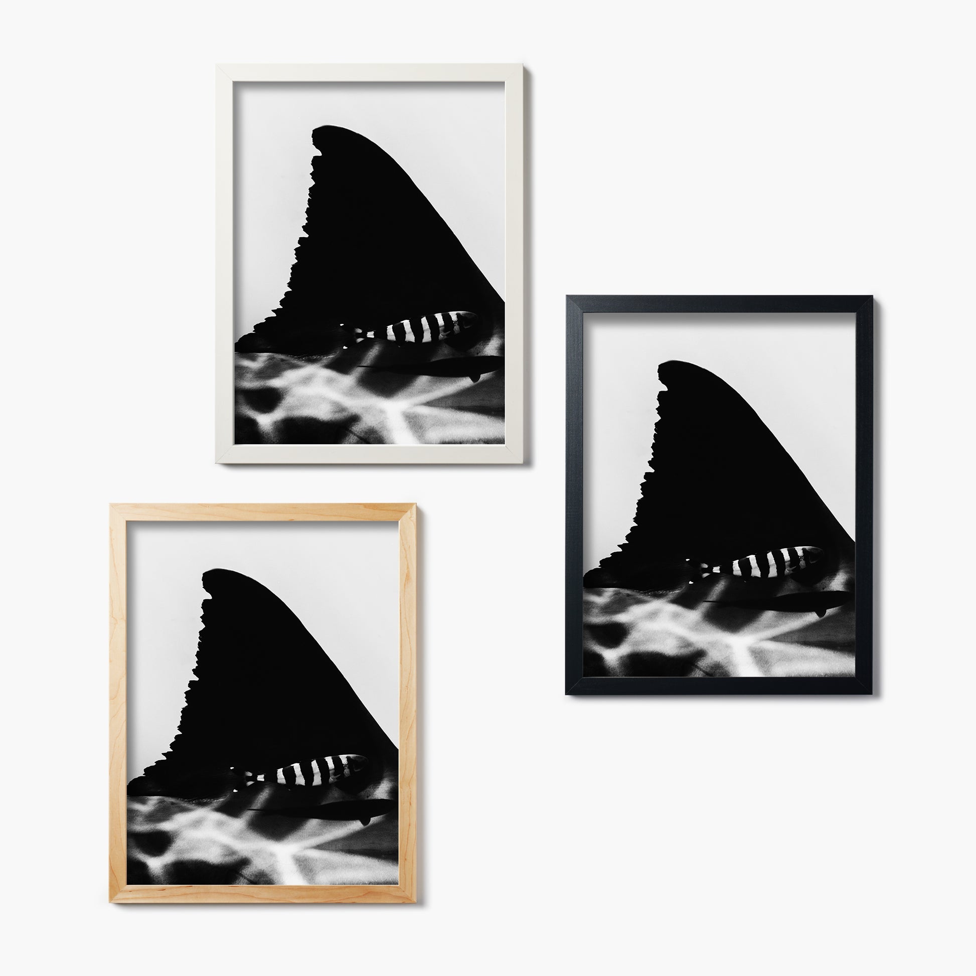 Shark in silhouette, stripes on escort duty. Photographer Mike Coots keeps it bold in black and white. 10% of proceeds from this print go to Sharks4Kids to support shark education, science, and conservation for the next generation of ocean advocates.
