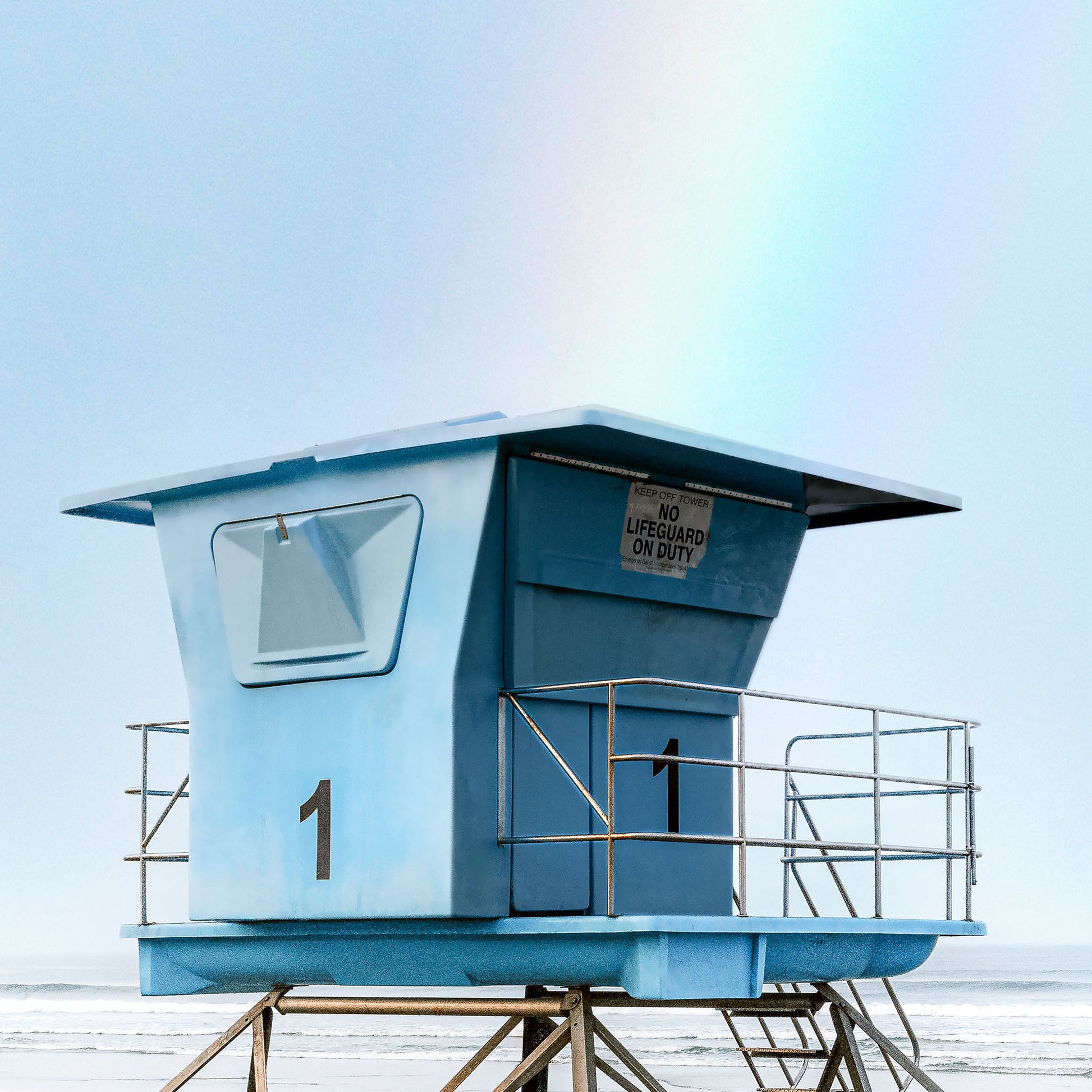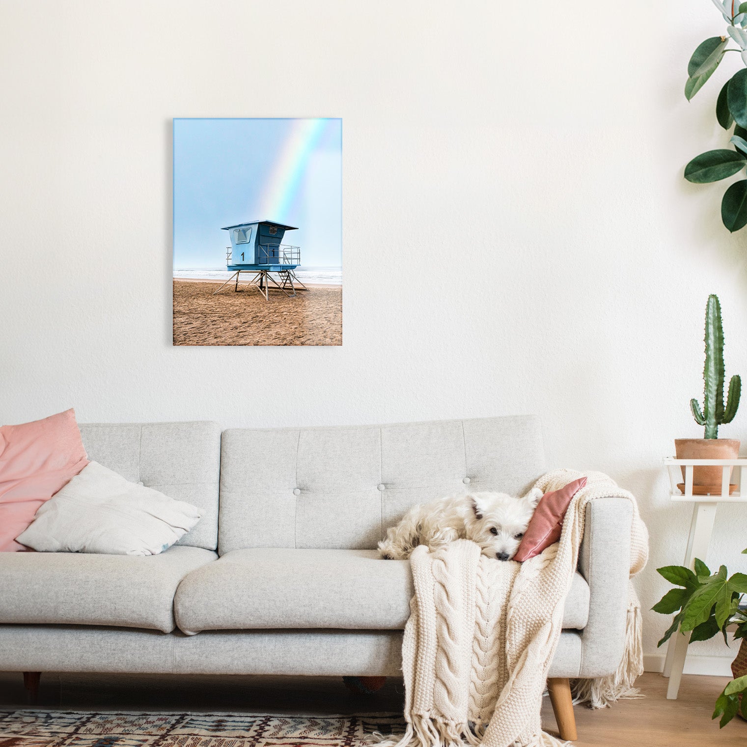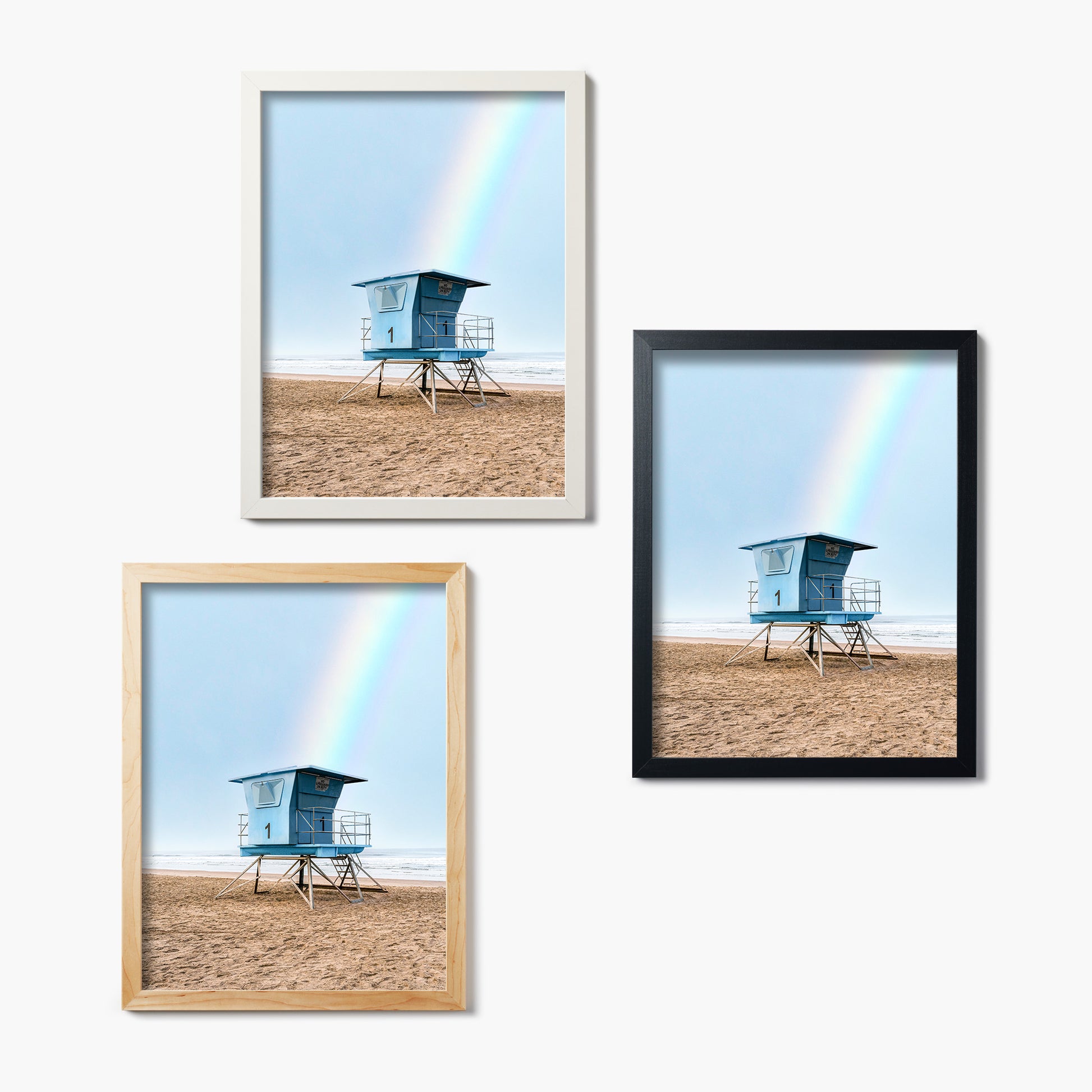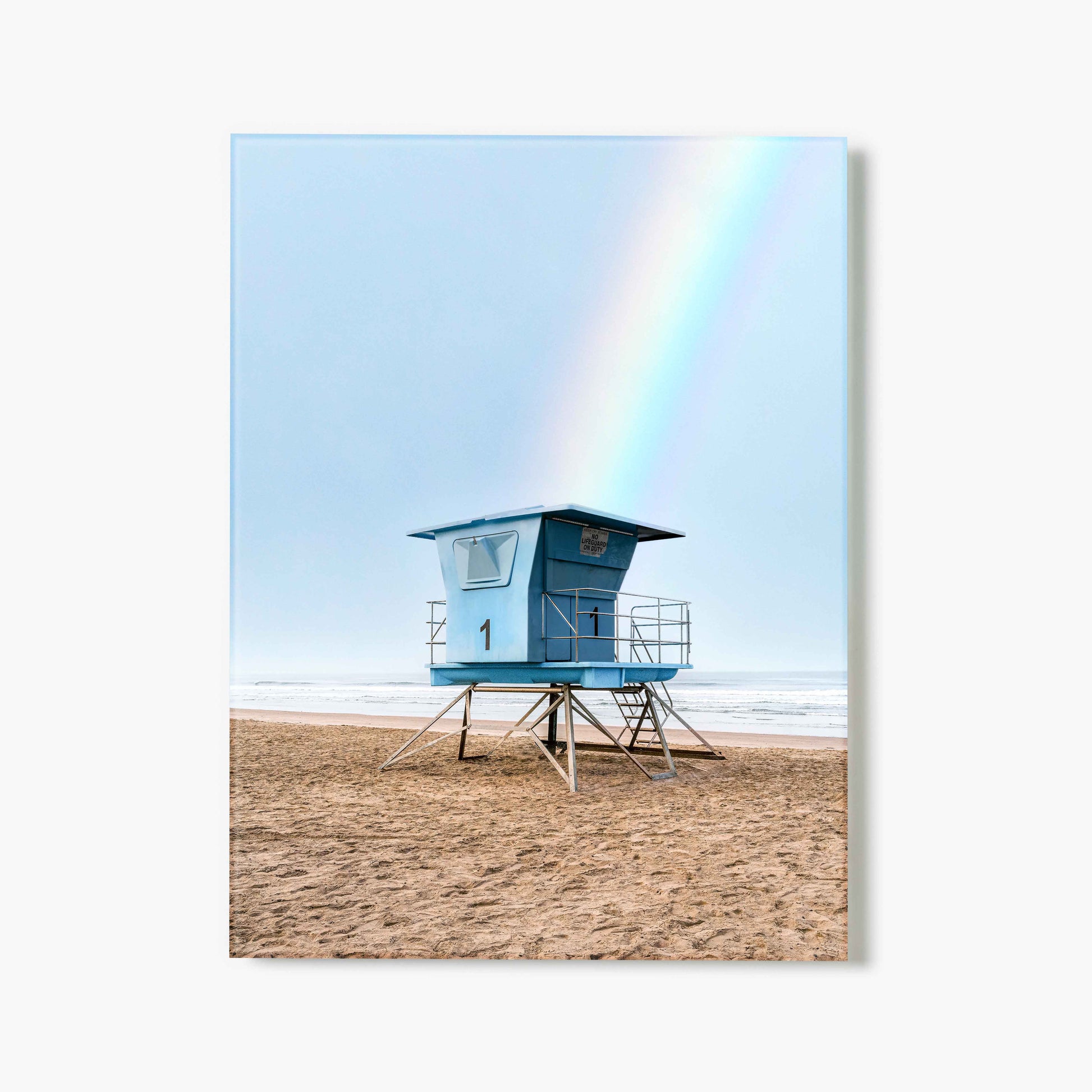 Casey Mac captures the kind of coastal magic that feels like a memory — hazy sky, the rush of waves, and a lifeguard stand kissed by a rainbow. Give any space postcard-perfect energy with this glass-printed California dream on your walls.