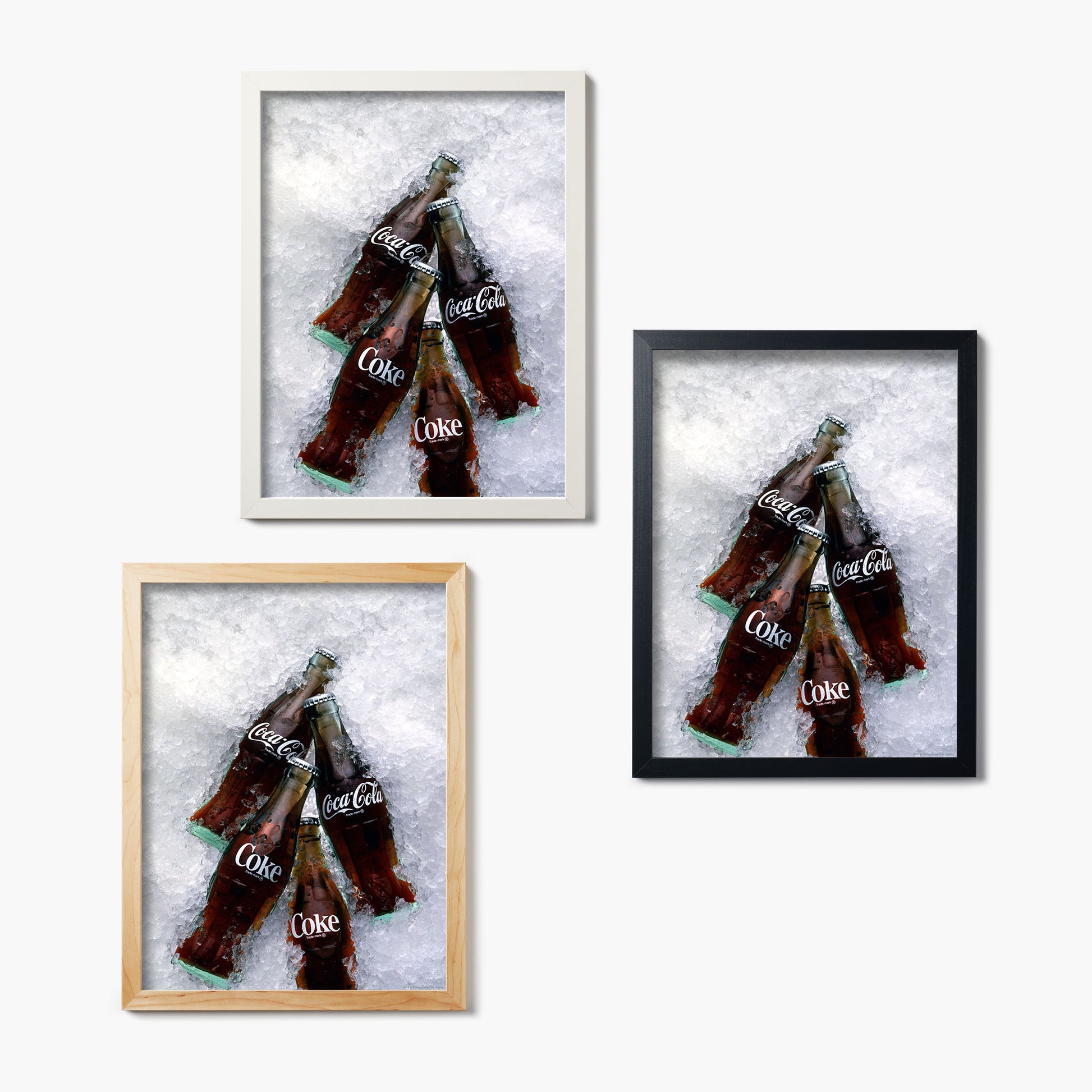 Refreshing in a bottle. Four perfectly chilled Cokes rest on a backdrop of crushed ice in this image from our Coca-Cola art collection. Printed directly on glass, this piece brings that iconic freshness straight to your wall—no cooler required.