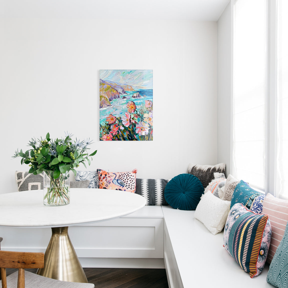 Windblown pink petals practically dance in this energetic coastal painting from Lisa Elley. Her impressionistic palette knife strokes shape candy-colored cliffs that jut out from a cheerfully turquoise ocean. A part of our Dopamine Decor collection, this piece is a little tropical, seriously magical, and will undoubtedly stand out on your walls.
