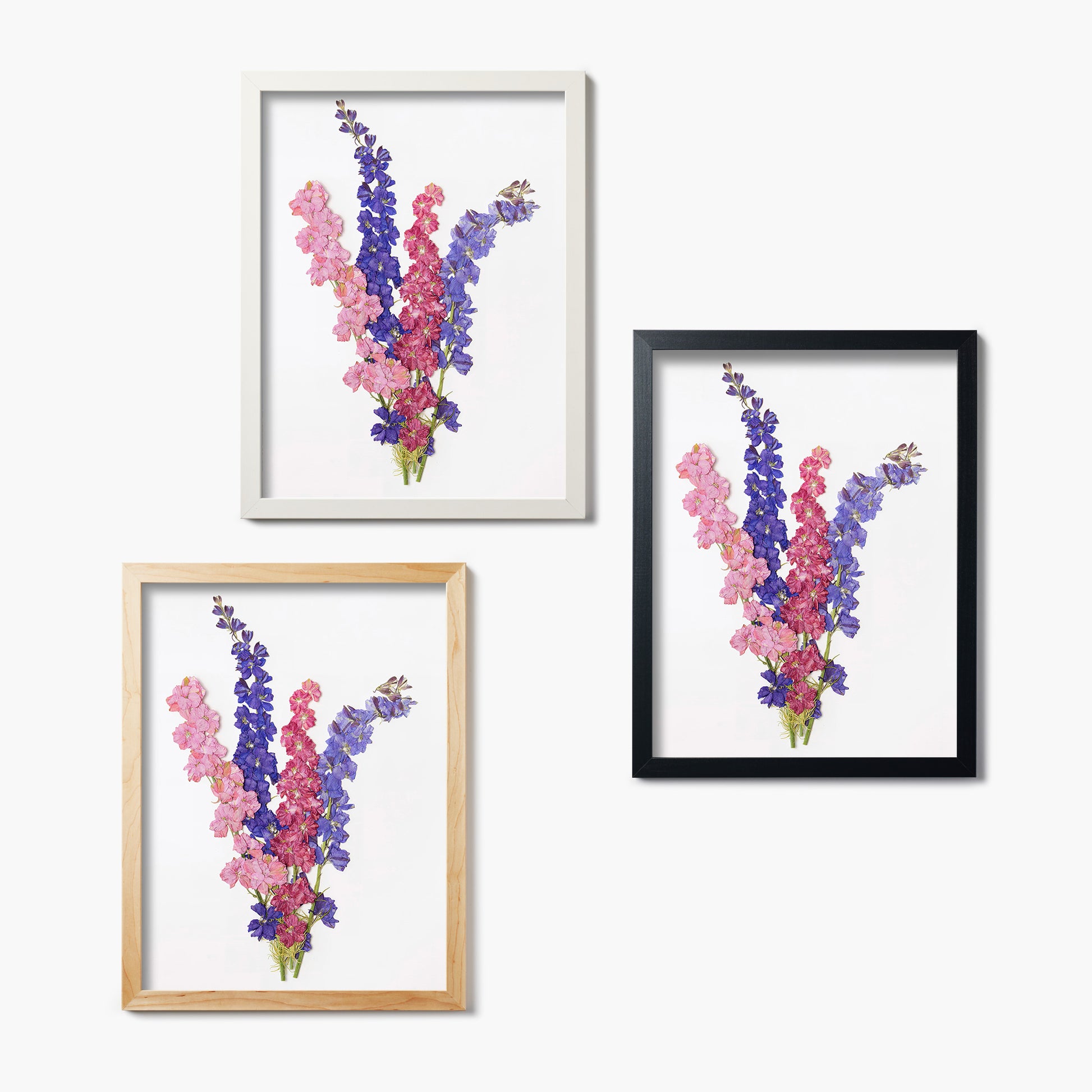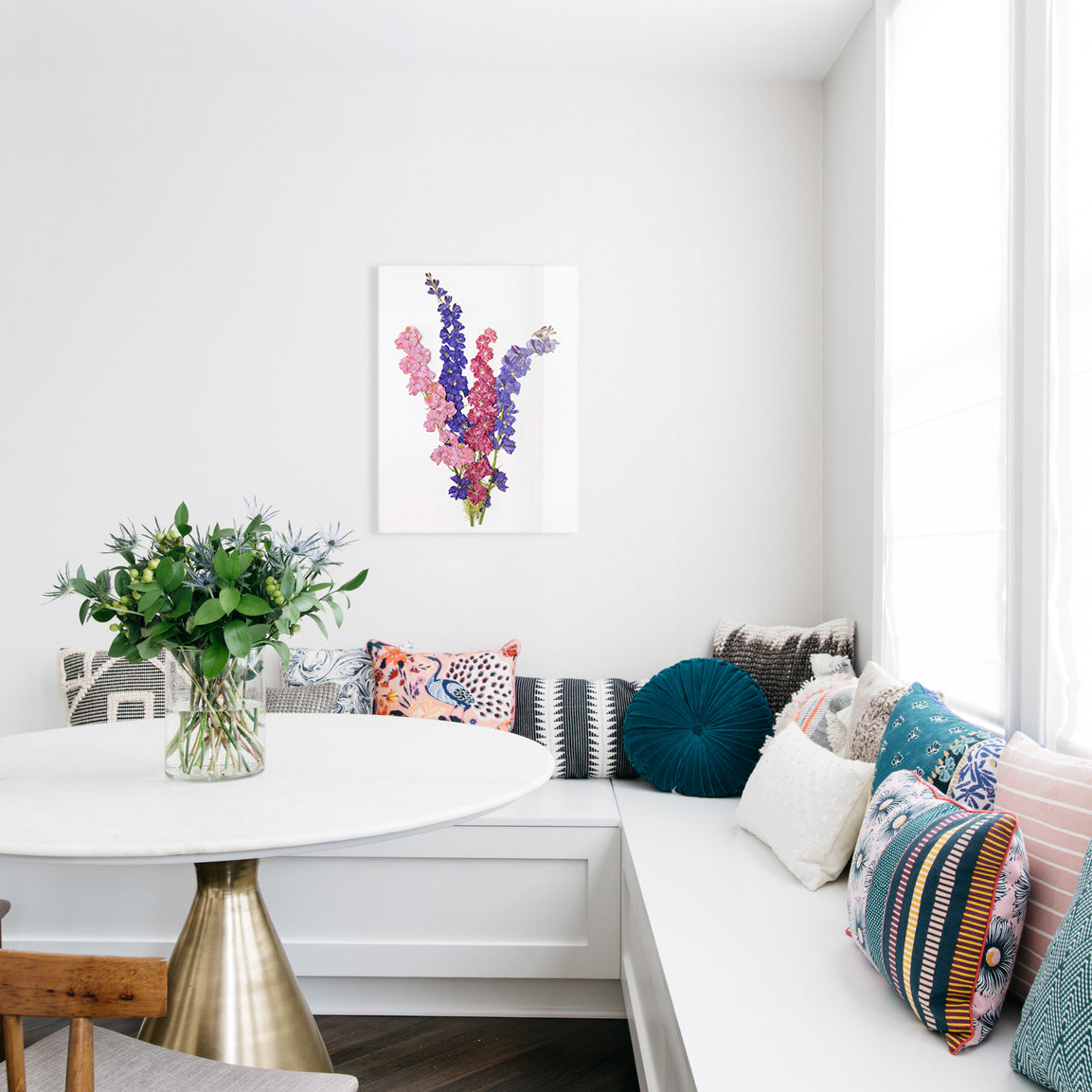 This multicolored arrangement of July larkspurs is as stunning as a firework. From the Pressed Florals collection, each strand of flowers bursts with color that would fill a fresh bouquet with envy. Photographed and printed on glass, these July blooms are ready to bring the energy to any wall.