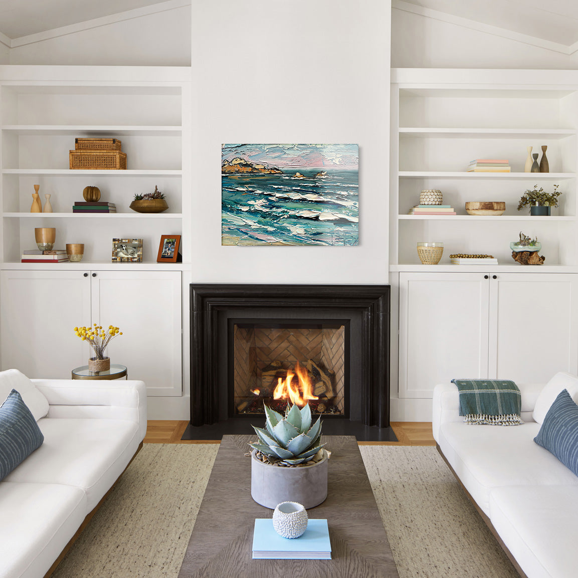 Who doesn't love that lavender haze? Foamy surf meets pastel skies in Lisa Elley’s bold, textured seascape. It’s a piece that instantly brings ocean calm and coastal charm to your space.