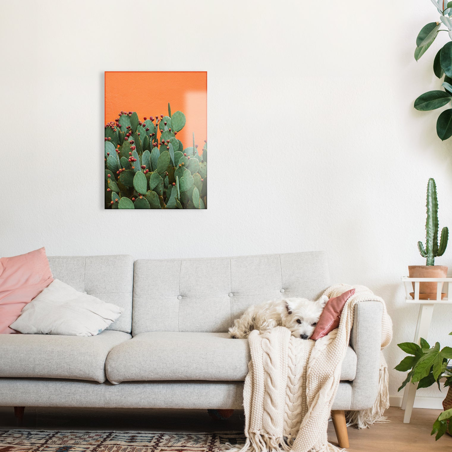 A cactus cluster grows in front of a bright orange wall like a desert bouquet. This prickly pear portrait by Casey Mac is is popping with red buds and bold hues. Add a splash southwestern warmth to any room with this succulent glass print.