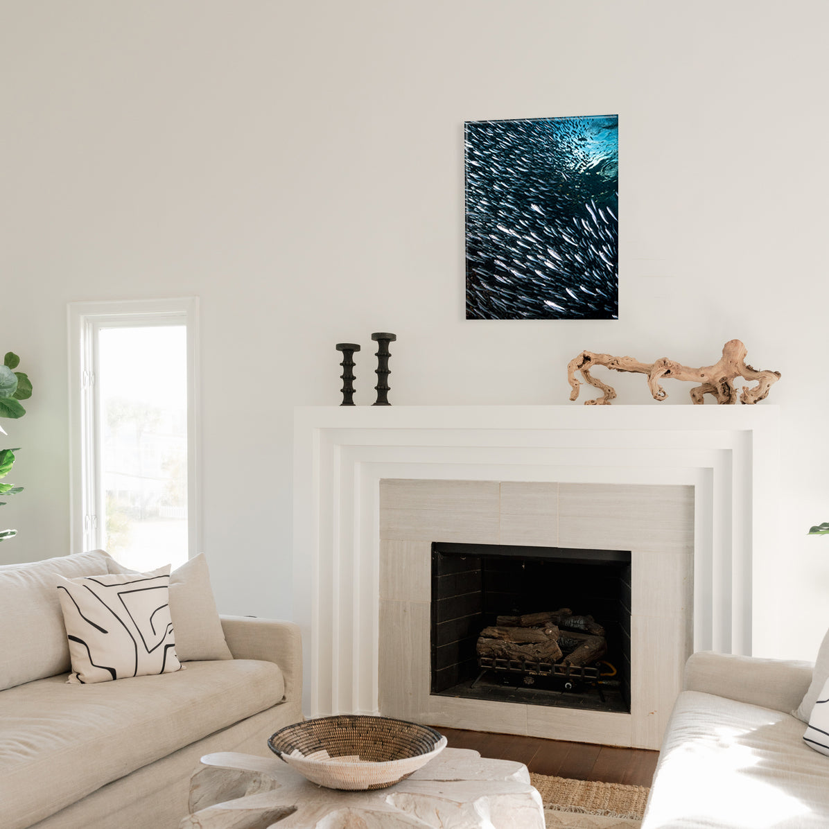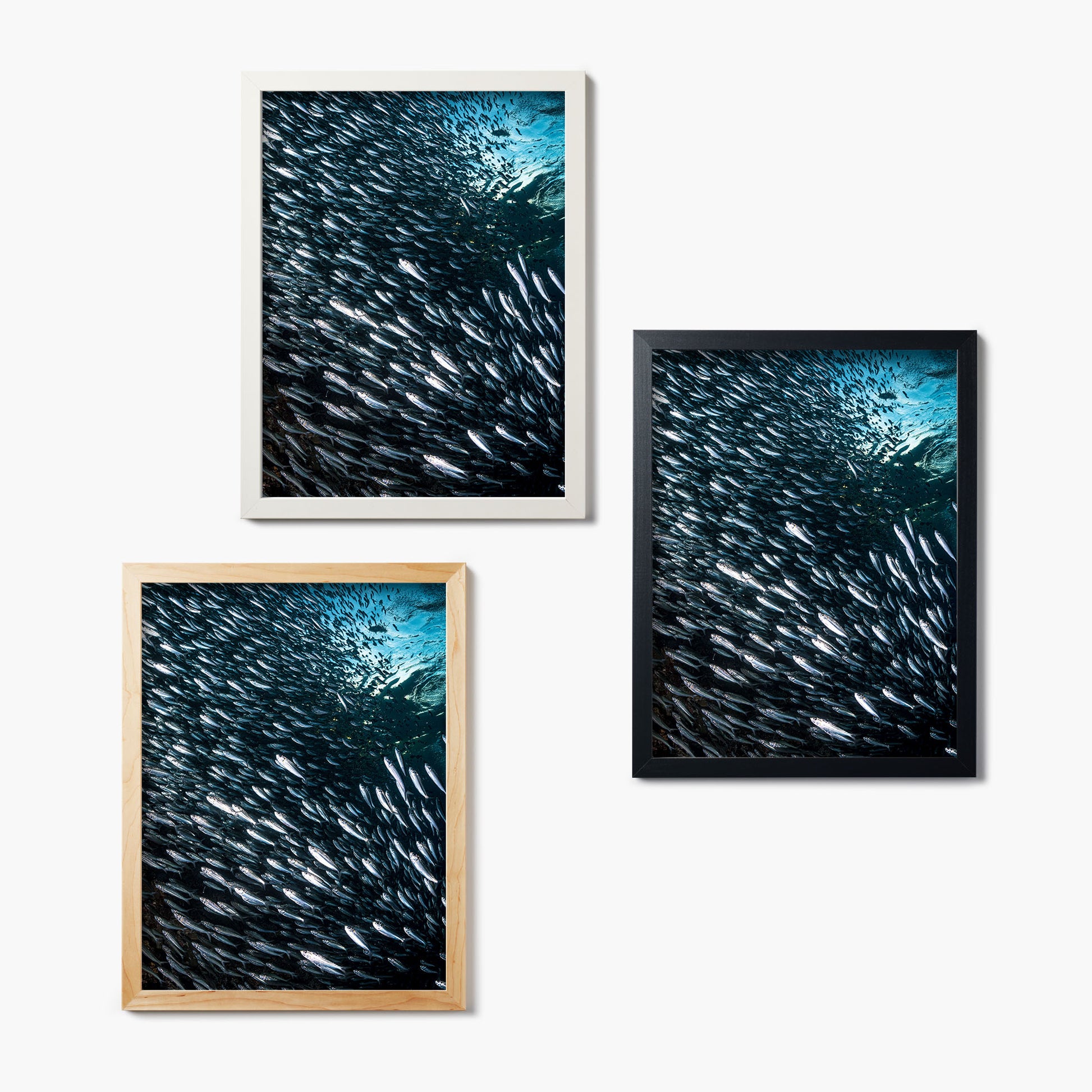 A shimmering silver tide, these sardines move as one—a living wave beneath turquoise water, stunningly captured by photographer Jay Clue's lens. Give your walls a little of that shimmer with this intricate underwater shot.10% of proceeds from this print go to Sharks4Kids to support shark education, science, and conservation for the next generation of ocean advocates.