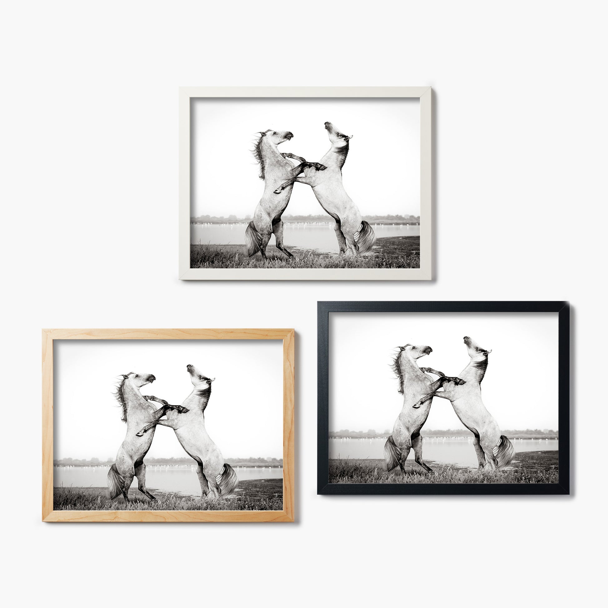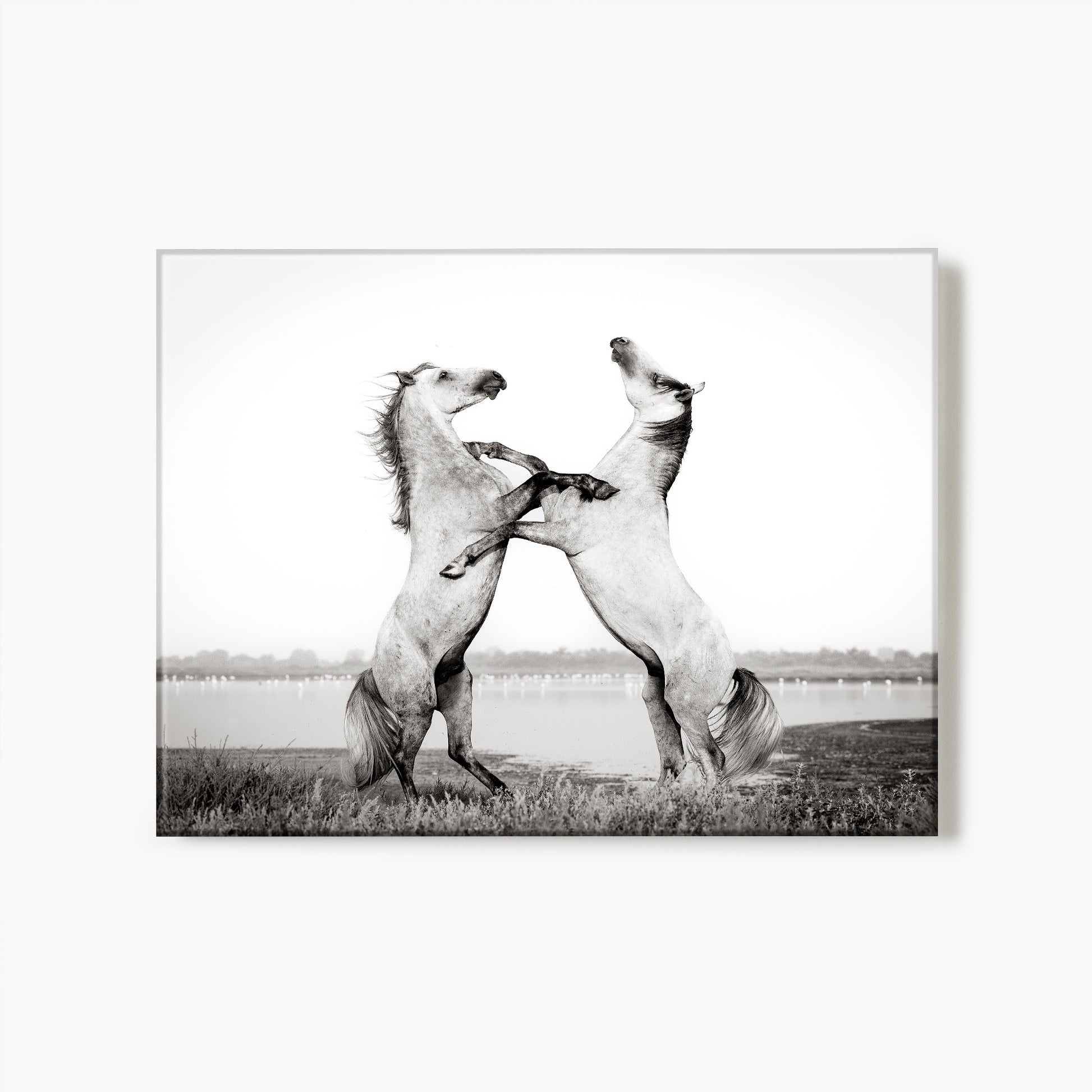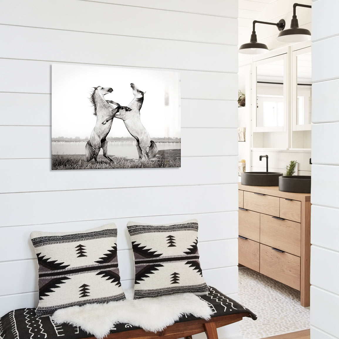Two stallions are captured mid-spar in stunning black-and-white in this portrait from Jan Birch. Part of our Western Spirit collection, this photo perfectly encapsulates the wild at heart. Add an instant modern ranch vibe to any space with a glass print that's nothing short of magestic.