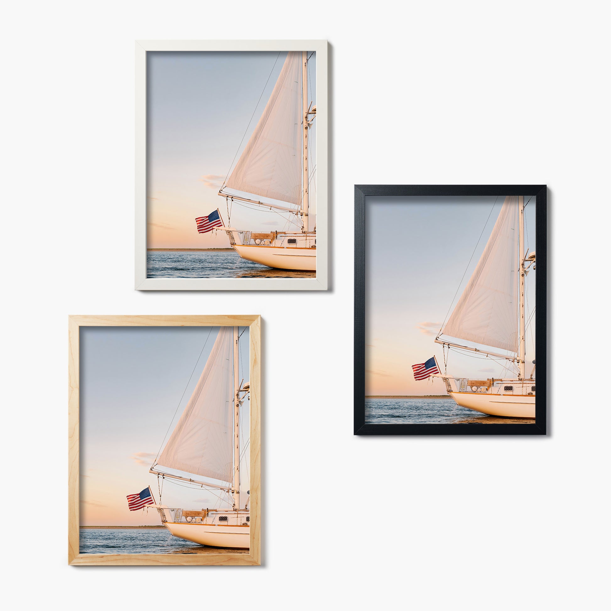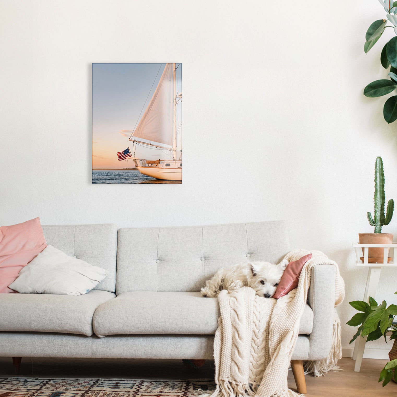 Golden hour hits just right on this classic sailboat moment from photographer Chelsea Victoria. Sunlit sails, serene water, and a fluttering flag at the stern makes this piece feel like effortless New England summer.