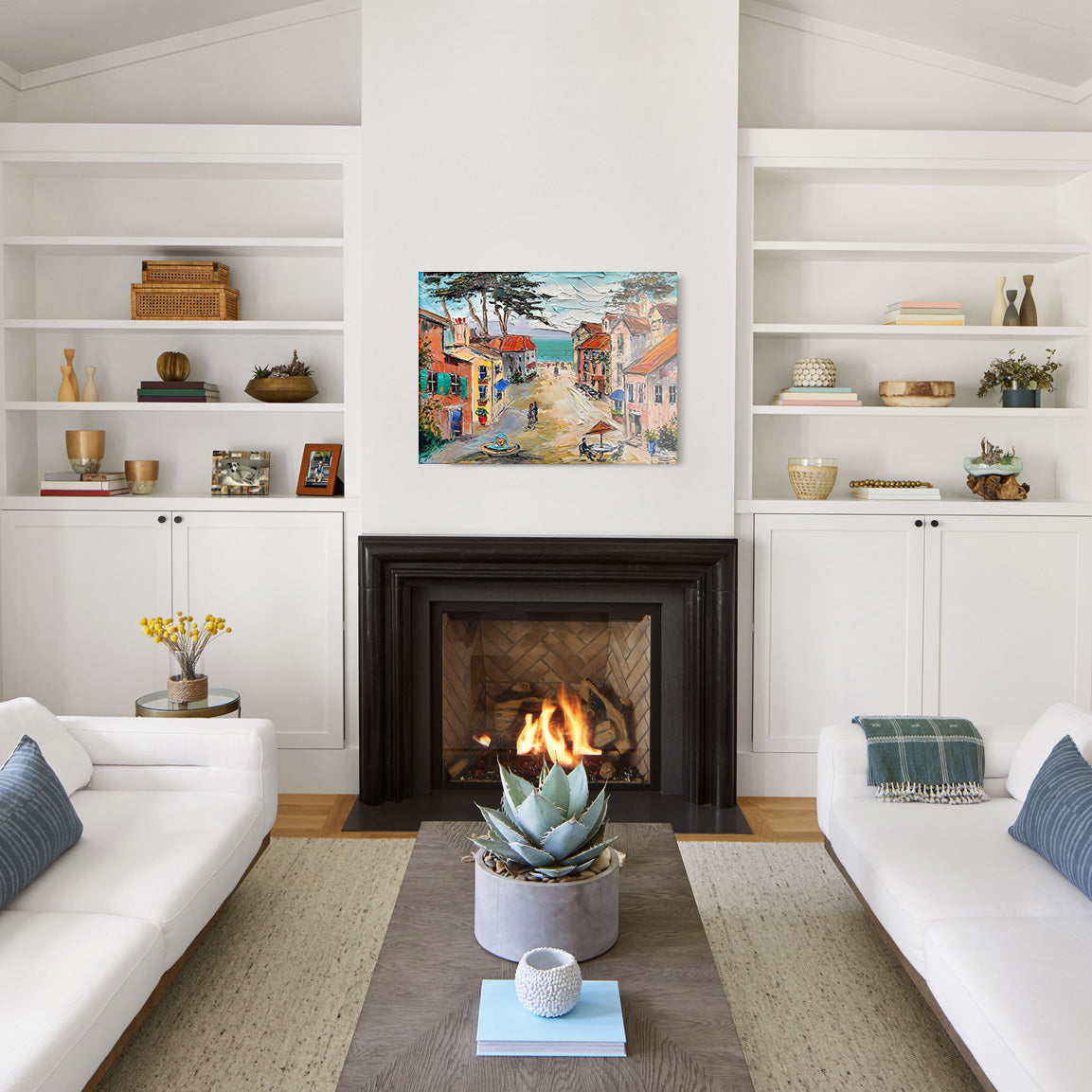 This is more than a painting, it's a textured memory by Lisa Elley. Each palette knife stroke forms a vivid, visual story where a sleepy coastal street opens its arms to the sea. Infuse your space with its vibrant energy and unmistakable charm, printed on glass.