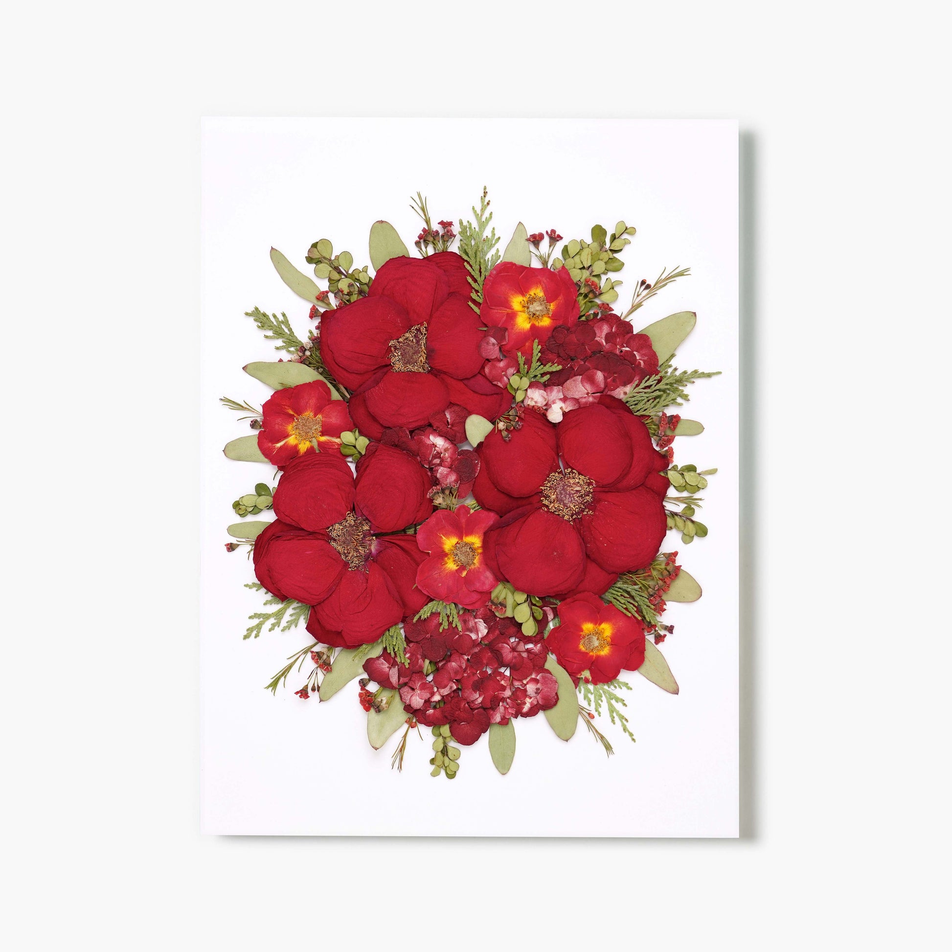 All the magic of a holiday bouquet, forever preserved. This scarlet showstopper is a stunning mix of pressed red roses, hydrangea, cedar, and more. This centerpiece from our Pressed Floral collection was arranged, photographed, and printed on glass to create a boldly elegant piece that will easily be the star of your holiday wall decor.
